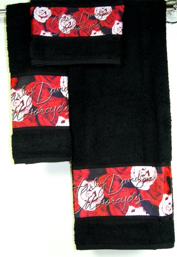 - Plush Black Fingertip towels embellished with flowery motifs and decorative band